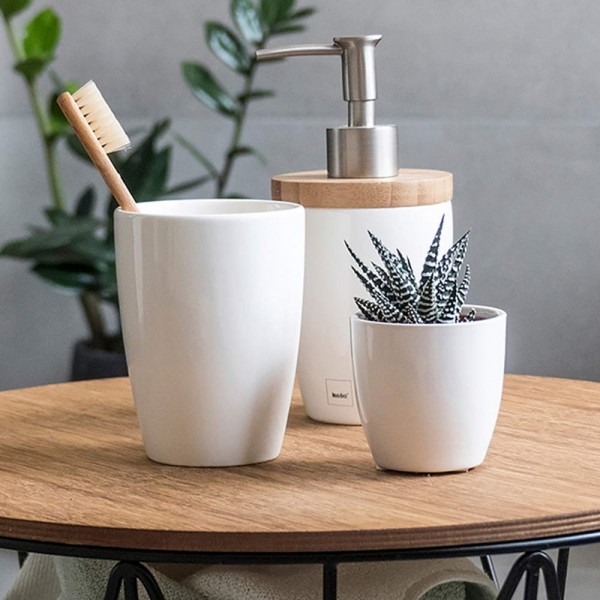 Създайте естествена атмосфера във вашата баня с красивите аксесоари за баня, изработени от бяла керамика. Елегантната поставка за четки за съби пасва на всяка баня и не бива да липсва в никое домакинство.