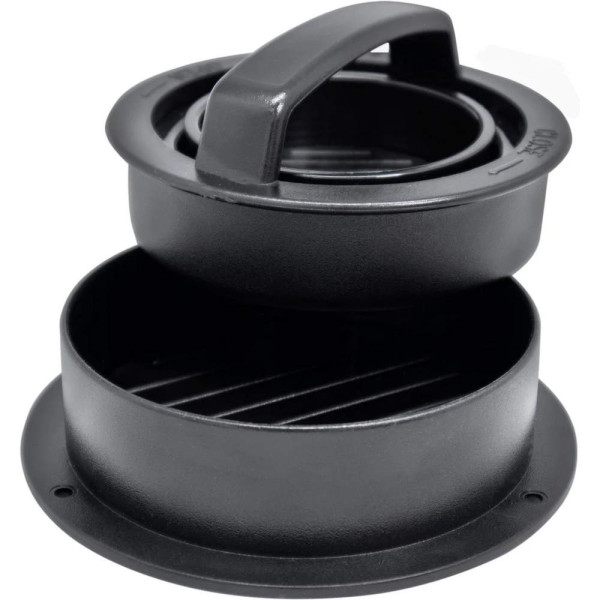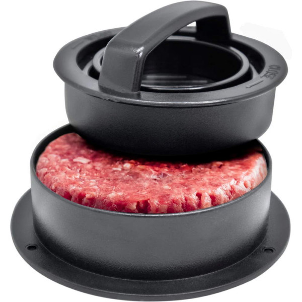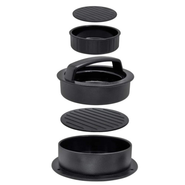 Пригответе перфектни домашни бургери с тази компактна преса, която може да се подрежда една в друга. Включва 3 функции: Малка основа + малка преса за стандартни бургери; голяма основа + голям натиск за XL бургери; допълнителна приставка за приготвяне на пълнени бургери (сирене, зеленчуци и др.).