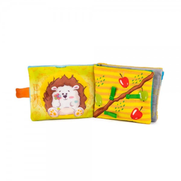 Мека бебешка книжка, изработена от напълно безвредни материали. Тя идва с грабващи вниманието цветове, а на всяка страничка вашето малко съкровище ще открива по нещо различно – сладко таралежче, плодно дръвче със шнурчета, страничка с бипка, шумоляща страничка с гризалка и какво ли още не! А с помощта на пластмасовия ринг, можете да закачите книжката удобно и лесно, където пожелаете!