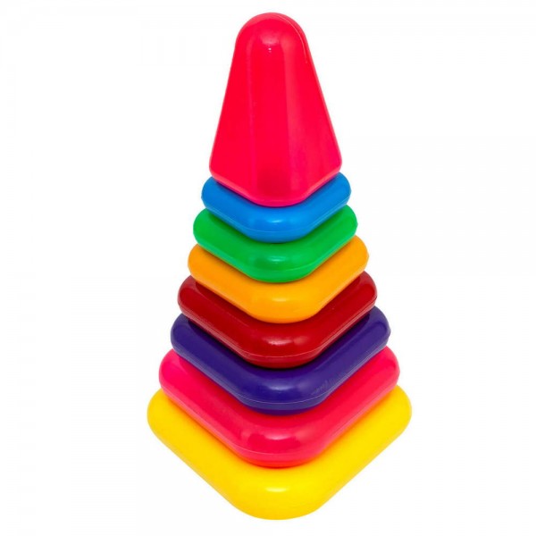 Бебешка образователна пирамида, която ще стимулира въображението и креативността на малките палавници. Съставена е от 7 триъгълни части и конус, които вашето мъниче трябва да подреди по големина върху основата. А докато го прави, то неусетно и на шега, ще се научи да разпознава цветове и форми, ще развива концентрация и координация, ще усъвършенства логическото си мислене и какво ли още не!