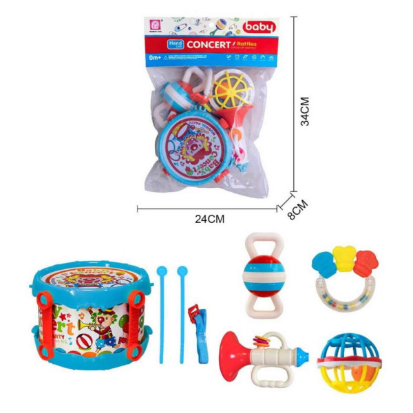 Бебешко барабанче с палки и текстилна презрамка, в комплект с тромпет и 3 дрънкалки-гризалки. Подходящо за момичета и момчета над 3 месеца.