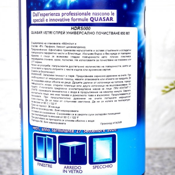 Описание на 0,65 л спрей за универсално почистване QUASAR VETRI: