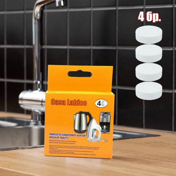 4-те таблетки опаковани поединично, са много удобни и подходящи за премахването на котленият камък от уредите. Използвайте една таблетка в 500мл. загрята вода и премахнете натрупаното замърсяване бързо и ефективно!