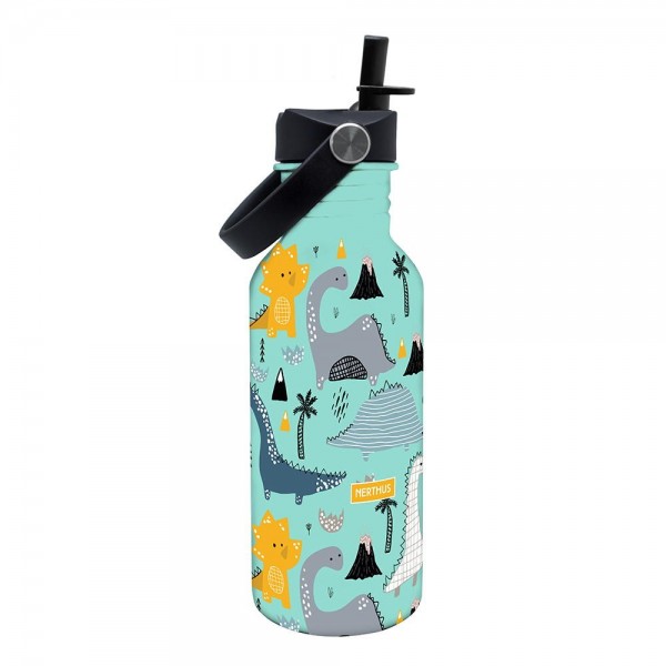 Описание на 500 мл детска стоманена бутилка с дръжка и сламка декор ДИНОЗАВРИ от Nerthus: