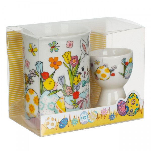 Комплект керамични чаша и поставка за яйце с великденски мотиви