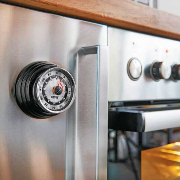 Механичния кухненски таймер RETRO от GEFU, отразява декоративния стил на 60-те години. Той ще ви напомни за края на времето за готвене, печене или накисване. Може да се настрои до 60 минути и винаги е на разположение, защото с помощта на магнит на гърба може да се постави на вратата на хладилника или на аспиратора.