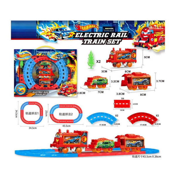 Детско влакче с релси. Комплектът включва локомотив на батерии, 2 товарни вагона, 2 дръвчета, релси. Чудесен подарък за рожден ден, Коледа или друг повод.