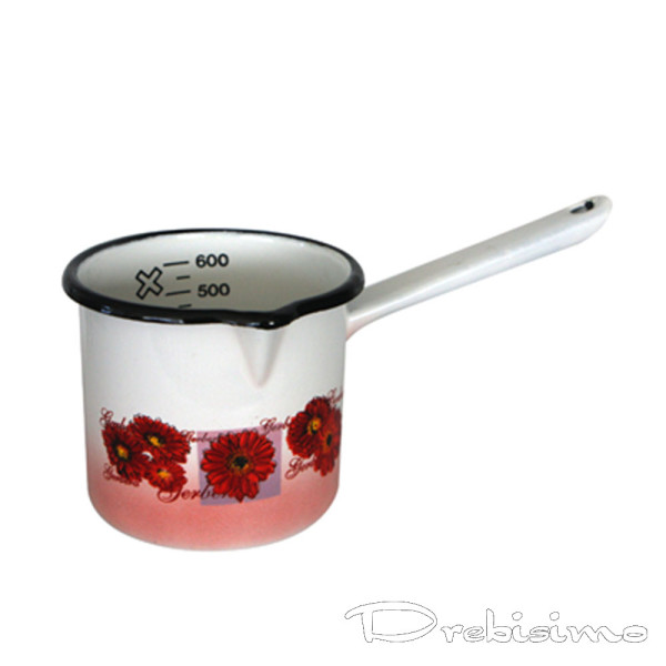 Описание на 600 мл бяло емайлирано джезве с декор Гербери: