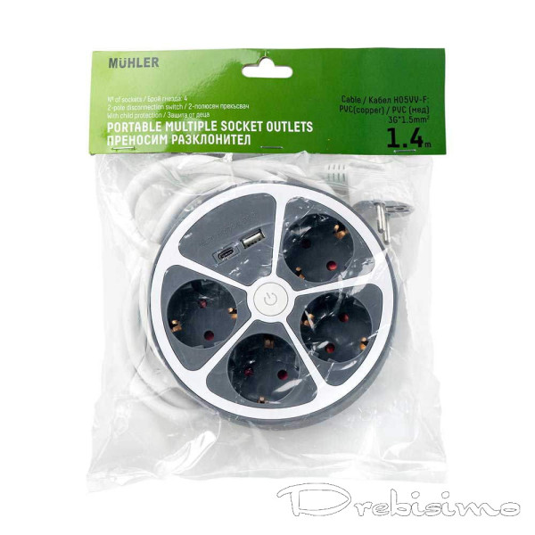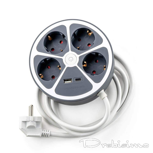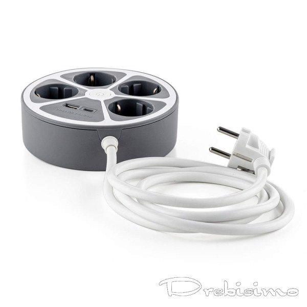 Удобен кръгъл разклонител с четири гнезда и два USB порта