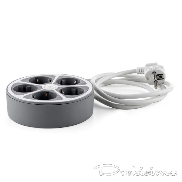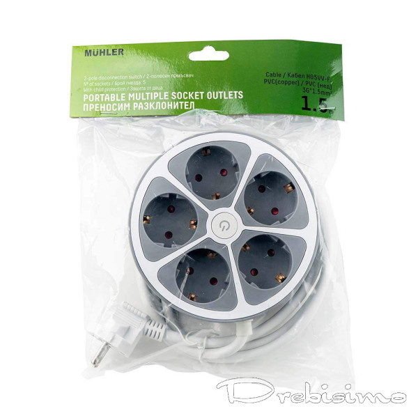 Описание на Кръгъл разклонител с ключ 5 гнезда и кабел 1,5 м: