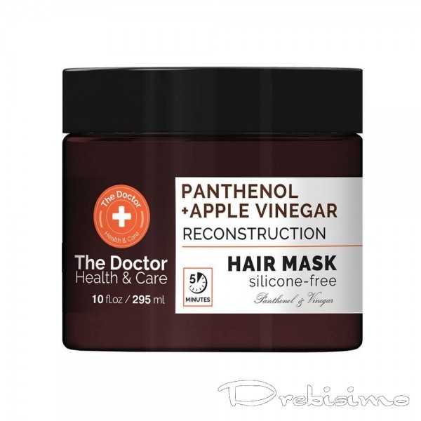 The Doctor Реконструираща маска с пантенол и ябълков оцет е продукт с комплексен ефект върху косата, като й доставя всичко, от което се нуждае. Тя прониква в дълбочина и подсилва действието на шампоана и балсама в рутинната хигиенизираща грижа, като осигурява максимална хидратация, регулира омазняването, регенерира и успокоява скалпа, подсилва косъма от корена до върха. Резултатът е красива, здрава, обемна, изпълнена с блясък и енергия коса.