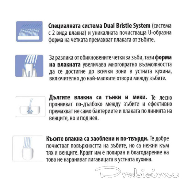 С помощта на четките за зъби Dr. NatureTotal Health Nano Charcoal, Dr. NatureTotal Health Nano Gold, Dr. NatureTotal Health Nano Silver и Dr. NatureTotal Health Nano Jade ще избелите зъбите си и ще освежите устната си кухина. Освен това четките действат в комбинация с пастата за зъби Dr. Silver за успокояване и още по-добро почистване на зъбитe. Четките Dr. NatureTotal Health имат специална система Dual Bristles System т.е. имат 2 вида влакна: дълги - тънки и меки и къси - заоблени и по-твърди. Дългите влакна са отлични при премахването на плаката около венците; дълбоко между зъбите; повърхността на кътниците и други трудно достъпни места. Освен това, дългите влакна стимулират и масажират венците и помагат за цялостното им почистване. Късите влакна са проектирани така, че да премахват петна и да полират зъбите. Четките Dr. NatureTotal Health имат уникална почистваща U-образна форма, която помага за премахване на плаката от зъбите. За разлика от обикновените четки за зъби, тази форма на влакната увеличава многократно възможността да се достигне до всички зони в устната кухина, включително до най-малките отвори между зъбите. Обикновените четки са идеална среда за развитие и разпространение на бактерии и микроби! За разлика от тях, наносреброто, нанозлатото, нанонефтита и нановъглена в Dr. NatureTotal Health Nano Toothbrush не позволяват на вредните микроорганизми да се размножават. Само няколко часа след измиване, четката ви вече е самопочистена и не съдържа бактерии и микроби. Така ползвате нова четка всеки път, когато си миете зъбите с четка Dr. NatureTotal Health! Произведени по нанотехнология с имплантирани във влакната нано злато, нано сребро, нано нефрит, нано активен въглен и с уникална U образна форма на влакната за цялостно почистване на зъбите.