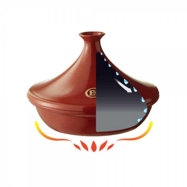 Създаден, за да подобри вкусовите качества на всяко екзотично ястие, приготвено в него! А най-доброто ястие никога не е най-сложното! Добрите ястия вдъхновяват и стимулират емоциите ви: консервирани лимони от градината, пресни или дъвчащи фурми, сочни цитрусови плодове и много други, всички вкусни обсипани с топли, ароматни подправки. След това всичко, което трябва да направите, е да го оставите да се готви и бавно да се задуши, без да се налага да мислите за него - керамиката Flame® разпространява идеално адаптирана, мека, равномерна топлина, независимо дали готвите във фурната или директно на котлона (газов, електрически или халогенен). Благодарение на формата на неговия капак, парата циркулира, ароматите се развиват и вкусовете се задълбочават, докато ястието се готви. Размерът му е достатъчно голям за приготвянето на 8-10 порции. И не забравяйте - тажинът е толкова красив, че силно препоръчваме сервирането му директно на масата, с вкусните гозби в него!