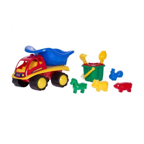 Цветният камион самосвал притежава просторна кабина, повдигащо се открито ремарке и колела, които ще преминат по всякакъв вид пътна настилка. И за да станат игрите още по-весели, камионът идва с цял арсенал летни забавления – кофички за пясък със сито, лопатка, гребло и 4 формички-животни. А устойчивата пластмаса, от която са изработени играчките, позволява интензивна употреба без притеснения за тяхната цялост, нито за избледняване на цветовете им. Опаковка: мрежа.