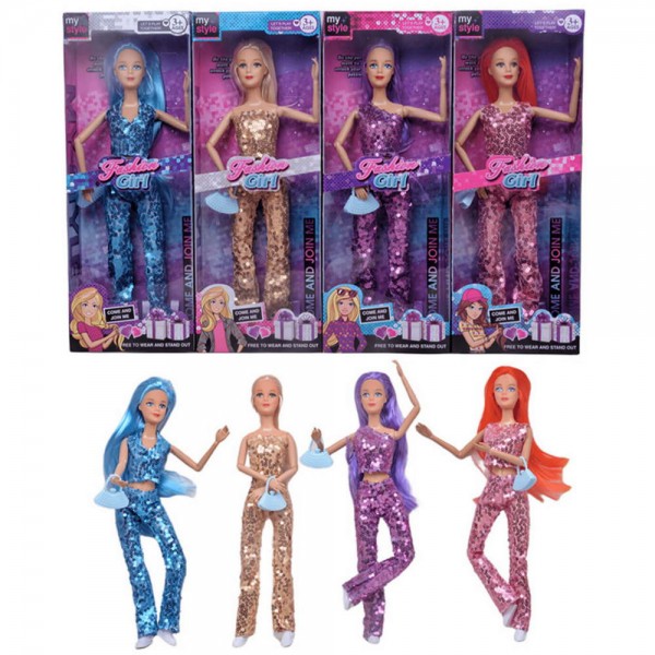 Очарователна кукла с дълги коси, облечена в блестящ костюм и обута с кокетни бели кецове. Изработена е от плътна, здрава пластмаса, като крайниците й се чупят в лакти, китки и колене. Красивата кукла държи в ръка малка чантичка, коята е перфектния завършек на звездната й визия.