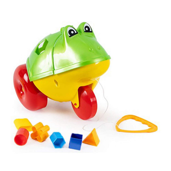 Образователна играчка сортер - жаба на колелца с въженце за дърпане. С 6 отвора и 6 формички. Идеална за стимулиране на логическото мислене у децата, разпознаването на цветовете и усъвършенстването на фината моторика. Подходящо за момичета и момчета над 3 години.