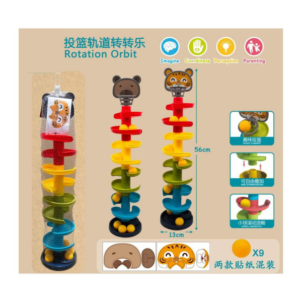 Образователна играчка кула с топчета. Състои се от основа, 8 спираловидни части, тигър с кош на върха, 9 топчета, стикер. Подходящо за момичета и момчета над 12 месеца.