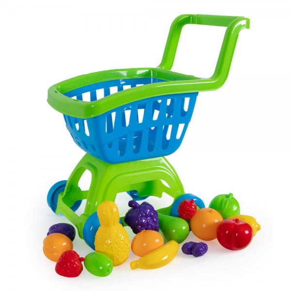 Пазарска количка в ярки цветове, които ще привлекат вниманието на всяко дете. Състои се от 2 части, които лесно се свързват една с друга, образувайки здрава конструкция. Подходяща за пазаруване с мама, разходка в парка или весели игри у дома. И това не е всичко! Количката идва с комплект пластмасови плодове (15 бр.), за да стане играта още по-реалистична и вълнуваща. А висококачествения материал, от която са изработени играчките, е издръжлив на активна употреба и устойчив на избледняване.