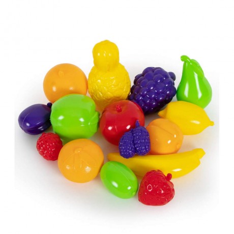 Детски комплект пластмасови плодове – вкусни, полезни и задължителни за кухнята на малката домакиня. Пригответе здравословен фреш или плодова салата, и поканете приятели, така игрите ще станат още по-весели! Комплектът съдържа: ананас, круша, портокал, грозде, банан, лимон, ябълка, лайм, боровинки, ягода, малина, слива, мандарина, домат, кайсия.