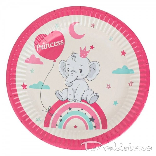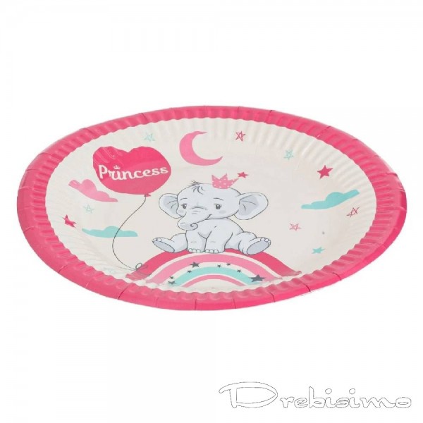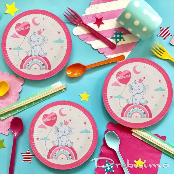 Цветните и забавни чинийки с декор слонче и надпис "Princess" гарантирано ще направят незбравим и щастлив детския рожден ден или бебешкото парти, а усмивките са гарантирани.