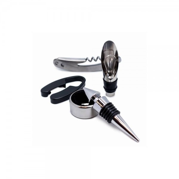 Стилен комплект от няколко аксесоара за вино, които ще Ви помогнат да покажете елегантност и финес на всяка романтична среща или вечеря с приятели. Практична резачка за фолио с 4 режещи колелца - просто трябва да стиснете и да завъртите. Професионален тирбушон с двоен лост, с покритие на спиралата за по-лесно навиване на корковата тапа. Уред за наливане - накрайникът се поставя в гърлото на бутилката. Ролята му е да прецежда виното и да улеснява наливането му в чашите. Пръстен за вино - след като отворите бутилката, го поставете на гърлото ѝ. Той ще улавя капките вино, които неминуемо ще се плъзват по бутилката, когато наливате. А когато вечерята свърши, можете да запечатате остатъка от виното в бутилката с помощта на тапата. Комплектът е подреден в елегантна и стилна кутия с дизайна на винена бутилка, което го прави идеален изискан подарък за любителите на виното.