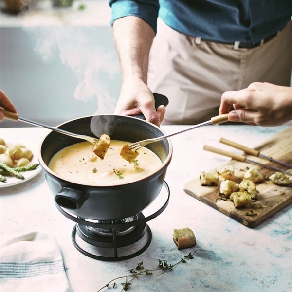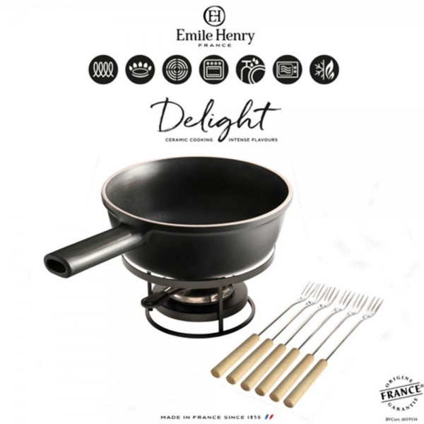 Комплектът за фондю „Delight“ ви позволява да приготвите вкусни фондюта със сирене или шоколад на всички видове източници на топлина, включително индукционни. Изработена от най-новата иновативна керамика, тенджерата е по-лека от класическите. Дългата, куха дръжка остава хладна и заедно с малката дръжка позволява здрав и сигурен захват. Керамиката „Delight“ разпределя топлината равномерно, позволявайки на сиренето или шоколада да се разтопят леко, без да прегарят. Сервира се директно на масата, а горелката (регулируема и презареждаща се) поддържа вашето фондю горещо през цялото време на хранене. Естествено незалепващата глазура е лесна за почистване (подходяща е за съдомиялна машина) и поддръжка.
