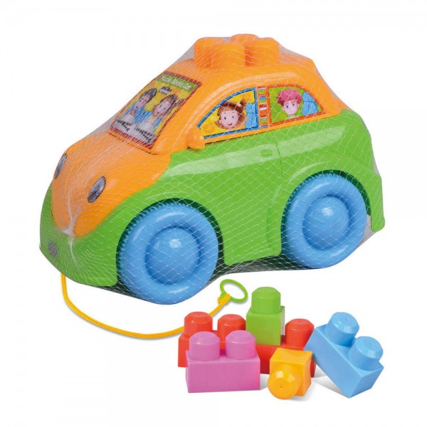 Шарена количка със забавна визия, която ще привлече вниманието на децата. Притежава връвчица за дърпане и отварящо се купе, което разкрива просторно място за съхранение с 5 строителни блокчета – 2 единични, 2 двойни и 1 четворно. На самия покрив на колата има строителна площадка, а това ще направи игрите още по-весели!
