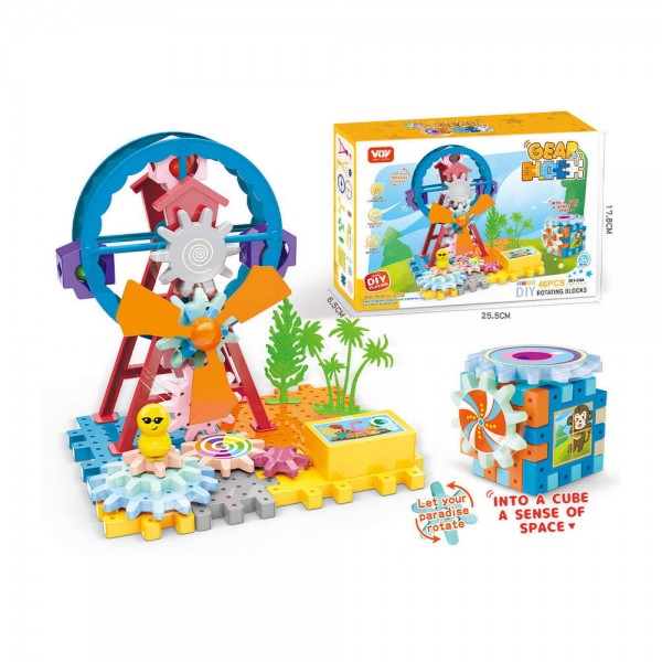 Един по-различен и безкрайно интересен конструктор, в който основните елементи са зъбни колела. Свържете ги правилно с другите строителни части, за да получите конструкцията, показана на кутията – страхотен увеселителен парк с виенско колело и перка! Но това не е всичко! Поставете батериите на захранващата кутия, за да се задвижи зъбното колело в основата й и по веригата да стигне до виенското колело и да го завърти. Забавно, нали? Съдържа лепящи стикери и книжка с инструкции.