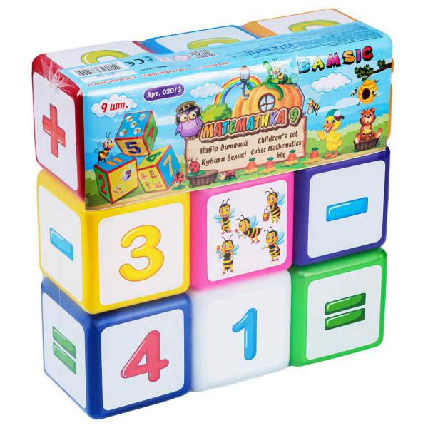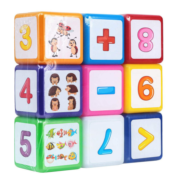 Детски комплект за игра от 9 пластмасови кубчета с цифри, математически знаци и животинки, които ще провокират въображението и креативността на малките палавници. И докато строят кули, а после ги събарят, децата неусетно ще усъвършенстват своите цветоусещане и концентрация, ще се научат да броят, да смятат и ще развиват още куп полезни дейности и качества, които ще са им в помощ по пътя на тяхното израстване.