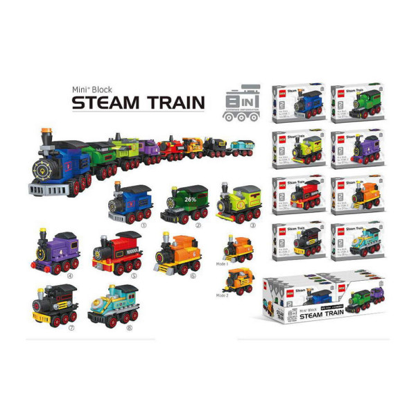 Забавен конструктор, тип лего, подходящ за по-напреднали строители. Има 8 различни мини конструктора, съставени от различен брой строителни части, съответно между 51 и 59. А всеки един локомотив може да се построи по два различни начина – забавно, нали? Двойно удоволствие, подходящо за самостоятелно забавление или весели игри с приятели!