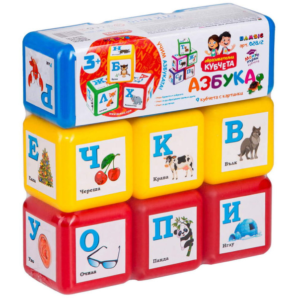 Комплект от 9 пластмасови кубчета с букви, думи и картинки, които ще провокират въображението и креативността на малките палавници. И докато строят кули, а после ги събарят, децата неусетно ще се учат да образуват срички и да четат, ще усъвършенстват своите логическо мислене, цветоусещане и концентрация, ще се научат да броят и ще развиват още куп полезни дейности и качества, които ще са им в помощ по пътя на тяхното израстване.