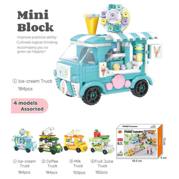Мини конструктор за момичета и момчета, тип лего, 4 вида камиончета за храна и напитки. Съдържа 153 – 184 съставни части и листовка с инструкции. Чудесен за развиване на въображението, логическото мислене и концентрацията у децата.