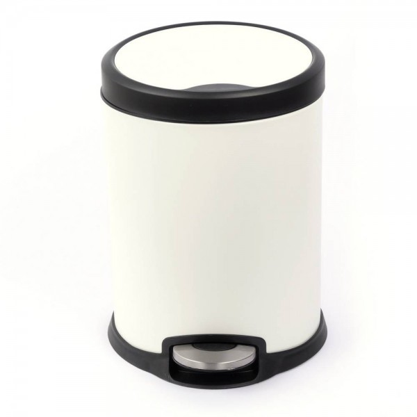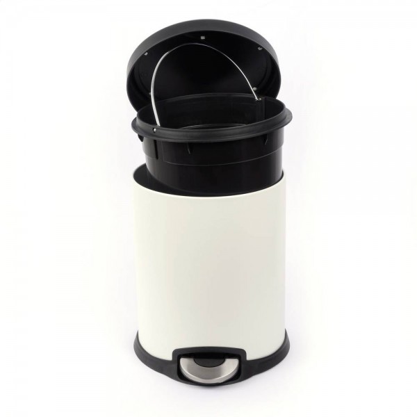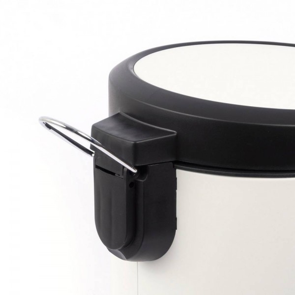 Стилен бял кош с педал и капак с функция за плавно спускане. Система на амортисьори гарантира безшумна работа на капака. Външният корпус на коша е метален и прахово боядисан в бял цвят. Отвътре има вътрешна пластмасова кофа с дръжка. Самият кош също има сгъваема външна дръжка разположена в задната част на пантата на капака.