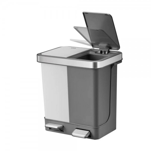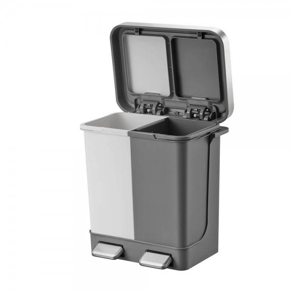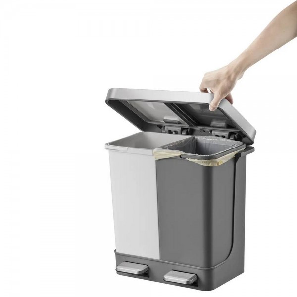 Този кош е снабден с две отделения, които се ползват поотеделно посредством двата педала. Той има плавно затварящ се капак с метална рамка, която държи торбите с отпадъци далеч от погледа ви. Видимите цветни вътрешни кофи улесняват разделянето на отпадъците, лесно се отстраняват и гарантират, че кофата може да се почисти бързо.
