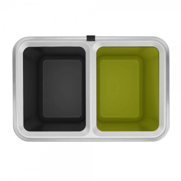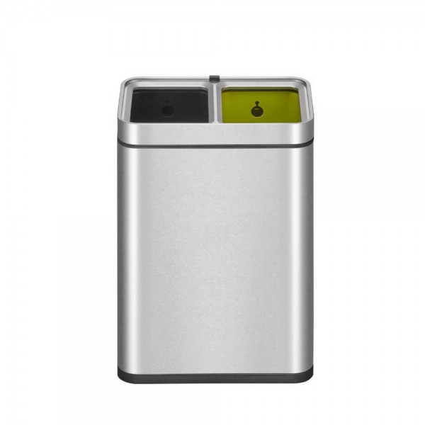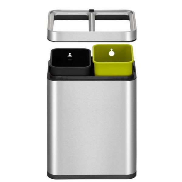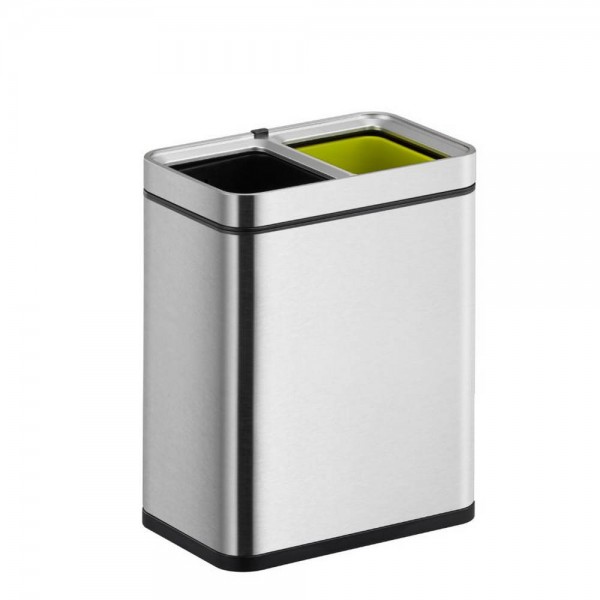 Стилен и спестяващ място отворен компактен кош за отпадъци от матирана неръждаема стомана. Оборудван с две пластмасови вътрешни кофи (2x 10 литра) и покритие, устойчиво на пръстови отпечатъци.