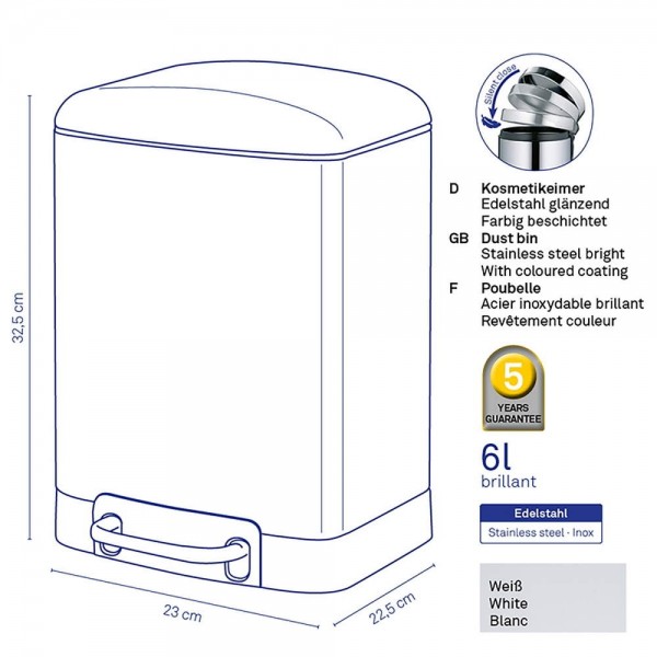 Описание на 6 л бял кош за отпадъци с педал KELA от серия Davino: