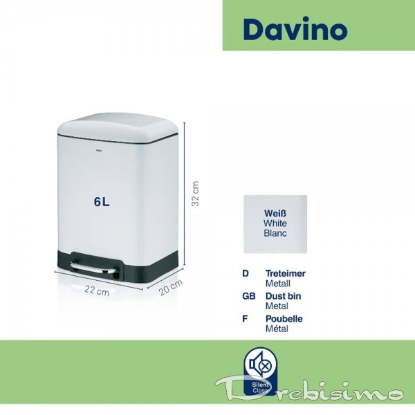 Кошовете с педал от серия Davino са с вместимост 6, 12 или 30 литра и са изработени от стомана, прахово боядисана за цветните модели. Те впечатляват с изчистения си дизайн и функционалност. Кошовете с педал са оборудвани с технологията Silent Close, т.е. капакът не пада просто при затваряне, а се затваря приятно тихо. Ако бутнете капака леко назад, когато е отворен, той остава в това положение и можете да извадите вътрешната кофа, за да я изпразните. След това можете да натиснете капака обратно надолу и той отново се затваря тихо. Идеален и спестяващ място: Благодарение на правата си форма, кошът Davino пасва добре в ъгъла или до стената. Цветните кошчета са с лъскаво, а иноксовите са с матирано покритие.