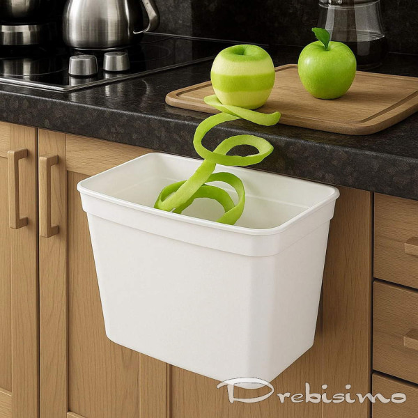 За да е лесна работата в кухнята, всичко трябва да ни е под ръка и на най-удобното място. Отпадъците по време на подготовка на продуктите, са често с не малък обем. Кошчето за отпадъци монтирано върху вратичката на кухненския шкаф, е перфектното решение за бързото им и лесно изхвърляне. По този начин моментално освобождавате място на кухненският плот и мивката за подготовка на следващите продукти. Не се налага да отваряте шкафа или да се протягате към друг прибор. Миенето и почистването на зеленчуци и плодове над мивката става лесно и удобно без излишно напрежение. Кошчето за отпадъци е изработено от здрава, еластична пластмаса, в бял цвят с универсална стойка за закачане. Лесно за почистване и монтиране.