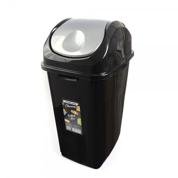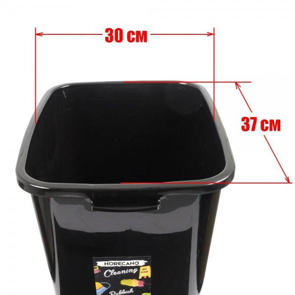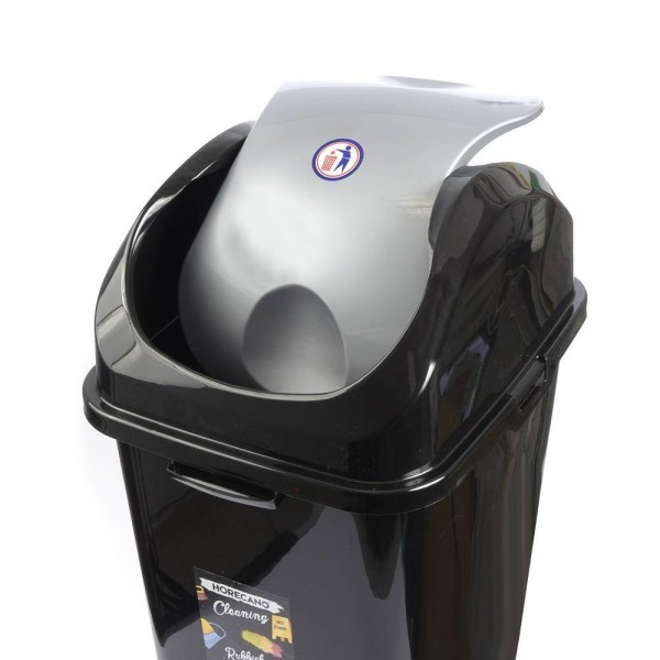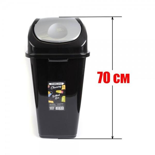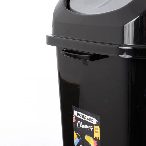 Стандартен кош за изхвърляне на боклук с обем 50 литра (габаритна височина 70 см.), изработен от черна лъскава пластмаса с люлеещ капак в лъскав сив цвят. Кошчето има по една дръжка на тесните си страни с цел по-лесно пренасяне и фиксиращи скоби на капака от другите две страни. С този кош HORECANO cleaning за пореден път предлагат удобен, качествен и функционален продукт на много добра цена.