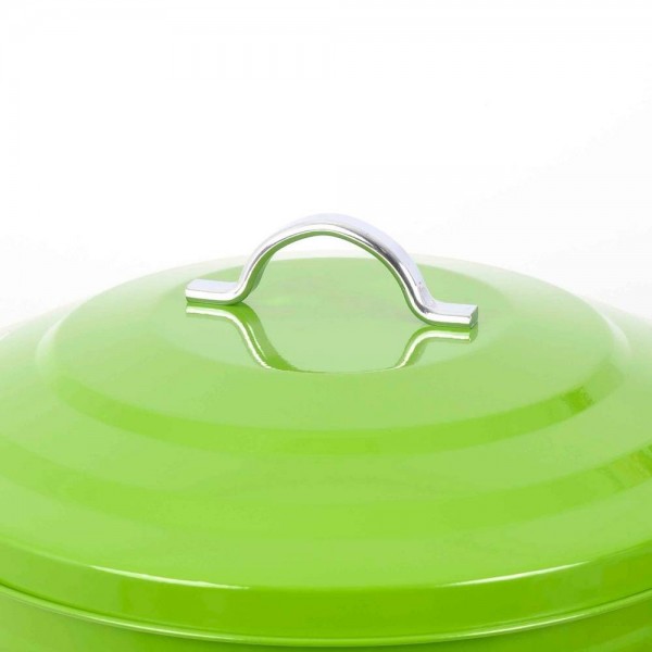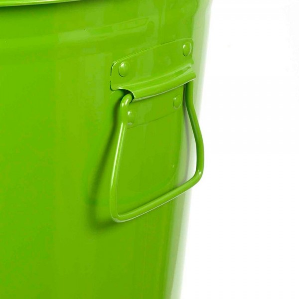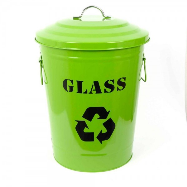 Ярко зелен метален кош за битови отпадъци с надпис GLASS (стъкло), разполагащ с метален капак с лъскава стоманена дръжка, удобни дръжки от двете страни за пренасяне - идеален за разделно събиране на ненужното, за да живеем в един по-добър и екологично чист свят. Кошът може да се използва самостоятелно или в комбинация с други кошове от същата серия, която съдържа общо 3 коша: син за хартия, зелен за стъкло и жълт за пластмаса. Другите модели може да видите под описанието на този продукт.