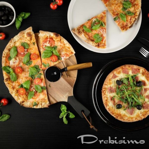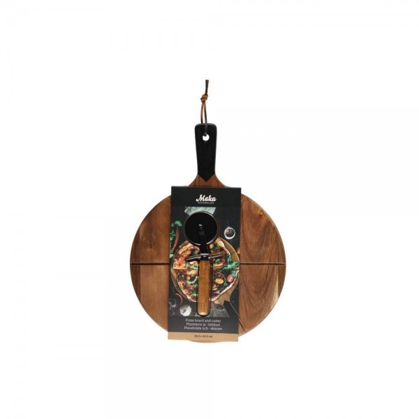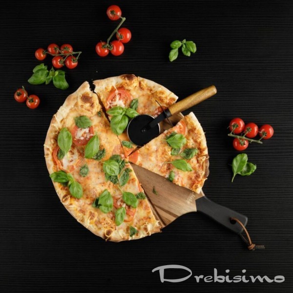 Стилен комплект за рязане и сервиране на пици. Той включва акациева дъска за рязане и сервиране с жлебове и нож. Острието на ножа е с незалепващо покритие. Препоръчва се измиване на ръка.