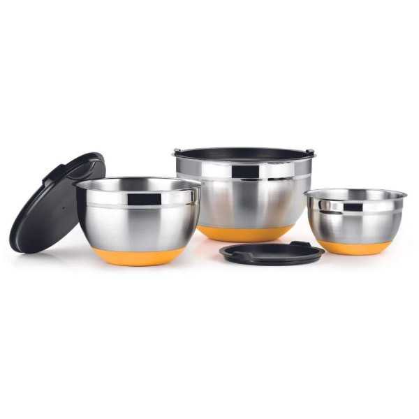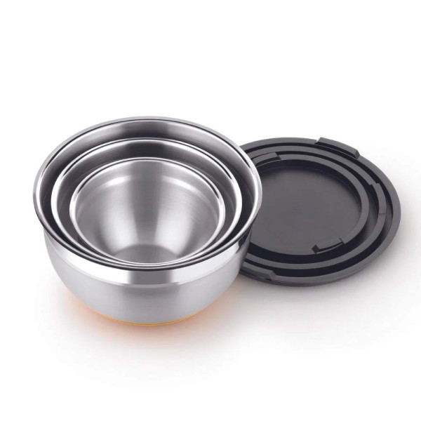 Комплект от 3 купи от неръждаема стомана със силиконова основа и капак. Купите Origen могат да се използват за смесване, приготвяне на салати, паста, размразяване и много други неща. Снабдени са с капак, което позволява да се използват като съдове за съхранение на храни и заготовки.