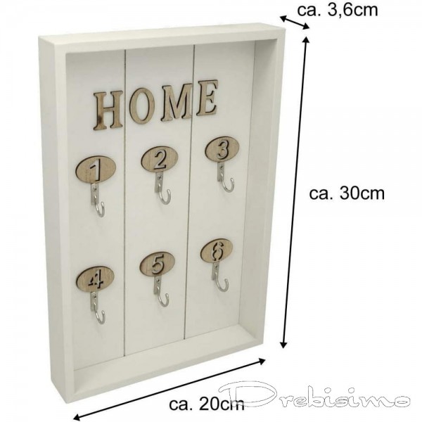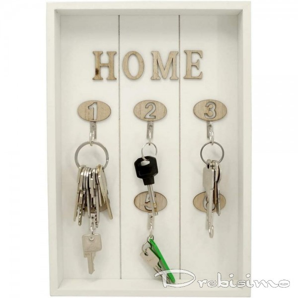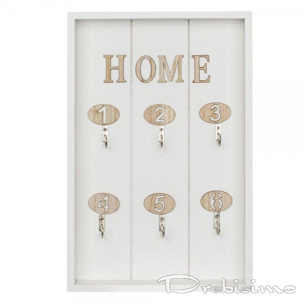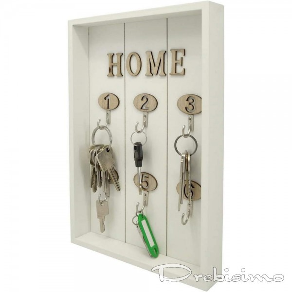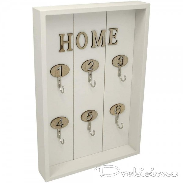Закачалката за ключове може да бъде оригинален и практичен подарък за новодомци. Изработена от дърво в бял цвят, със шест номерирани кукички и красив надпис HOME над тях.