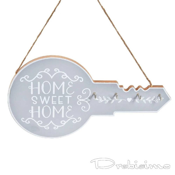 Закачалката за ключове може да бъде оригинален и практичен подарък за новодомци. Изработена от дърво в сив цвят, с форма на ключ и надпис "Home sweet home".