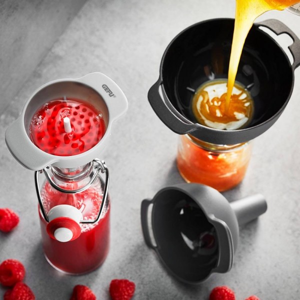 С TRES намирането на подходящата фуния за наливане на течности е толкова лесно. Този комплект ви спестява място, защото фуниите се прибират практично и удобно една в друга. Филтърът е подвижен и е подходящ и за трите, а материалът, от който са изработени ги прави устойчиви на температура до 100°С.