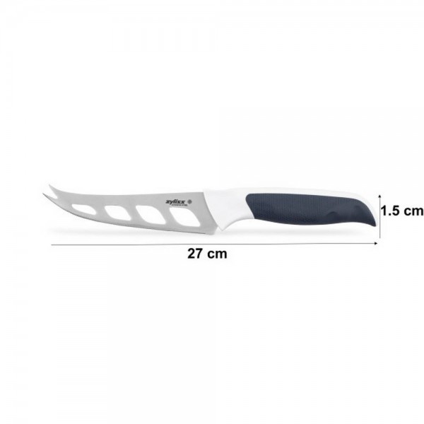 Ножът за сирене Comfort на Zyliss разполага с 12-сантиметрово острие с микросеретации, които улесняват рязането на твърди и меки сирена. Отворите в острието са проектирани така, че сиренето да не залепва по острието. Ергономичната дръжка е проектирана за максимален комфорт при ежедневна употреба. Тя стои удобно в ръката, което позволява здрав и стабилен захват дори при продължителна употреба. Всеки нож има точки за контрол по време на рязане. В основата на острието, при дръжката, е точка за палеца на режещата ръка, която осигурява лесно направляване на ножа, баланс и контрол по време на работа. Точката в горната част на острието е за помощ от свободната ръка, за по-добър контрол при прецизно рязане. Всички ножове се предлагат с предпазител за безопасно съхранение и за защита на острието, когато не се използват.