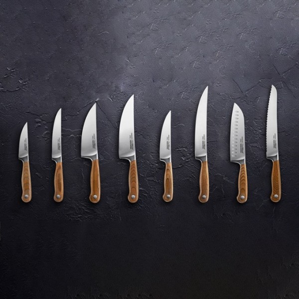 Порционен нож за рязане на месо. Ножът е с удобна дръжка от стабилизирано ясеново дърво и масивно V-образно острие за перфектна острота. Стабилизацията е специален вид обработка на дървото, при който порите му се запълват със специални защитни съединения. На първо място, тези действия са насочени към увеличаване на декоративните качества на дървото, така че те да останат непроменени възможно най-дълго. В същото време се увеличават показателите за твърдостта на материала, както и устойчивостта на влиянието на външни фактори. Режещото острие е изработено от първокласна японска неръждаема стомана.