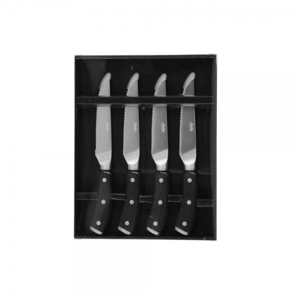 Висококачествен и стилен комплект от 4 бр. ножове за стек и пица, изработени от висок клас немска молибден - ванадиева стомана с твърдост HRC 56 +/- 2. Дръжките на ножовете са изработени от красиво и много издръжливо дърво пака. Не са подходящи за съдомиялна машина.