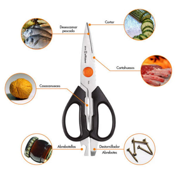 Кухненските ножици BRA от серия Efficient са многофункционални ножици, които трябва да имате във вашата кухня. Можете да ги използвате всеки ден благодарение на множеството функции, които включват. Ако търсите функционални, универсални и ефективни ножици, които ще ви позволят да спестите време в кухнята, определено имате нужда от тях! Острието на ножиците е изработено от немска неръждаема молибден-ванадиева стомана, известна с високото си качество и издръжливост. Дръжката е изработена от полипропилен и осигурява удобен захват благодарение на напълно ергономичния си дизайн.