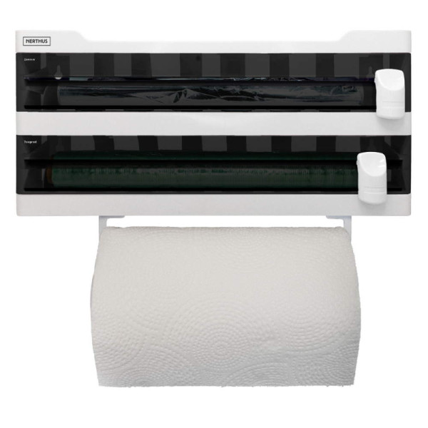 - Оптимизиране на пространството: Проектиран специално за кухни с ограничено място, нашият органайзер оптимизира използването на пространството. Органайзерът за стенен монтаж за кухненска ролка съчетава различни функции в едно, което Ви позволява да имате повече свободно пространство на работната повърхност. Освободете място в чекмеджетата и шкафовете си, като организирате и разполагате с Вашите фолиа, подправки и кухненска хартия на едно място.